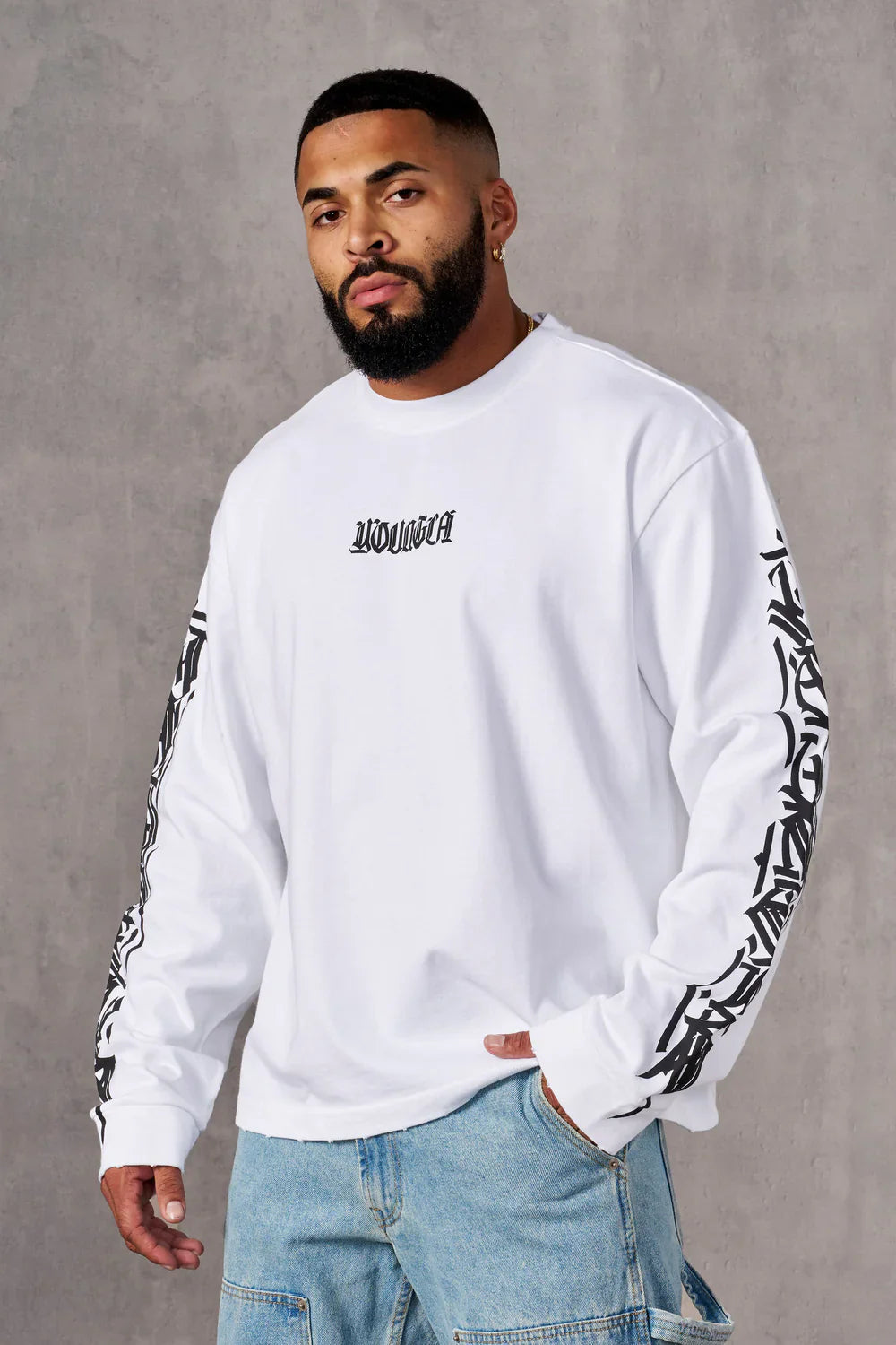 Crafted from 100% cotton with a weight of 350 GSM, the Aura Long Sleeves Black Wash tees offer a comfortable and loose fit. Distressed details on the cuffs and hem add a touch of ruggedness, while the acid wash treatment gives it a vintage feel. The bold puff-printed calligraphy running down each sleeve is sure to catch eyes. �����